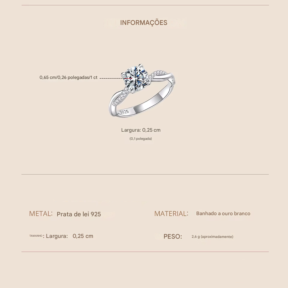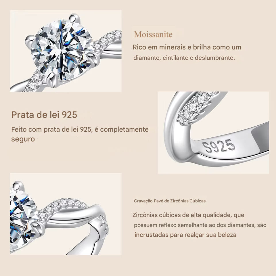 Anel Afrodite em Prata 925 e Moissanite como pedra central, as pedras laterais em Zircônias de alta qualidade, essa peça é uma tradução de beleza e luxo.
