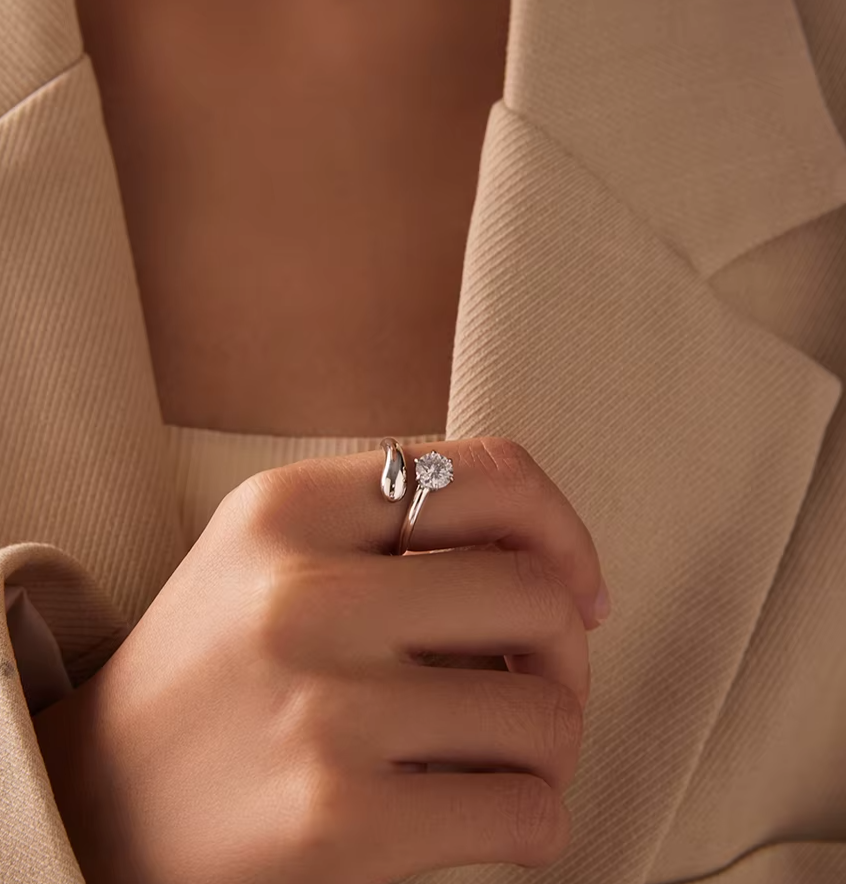 Anel Ingrid em Prata 925 e Moissanite, ajustável, ideal para uso em mais dedos conforme combinar com seu Look do dia!