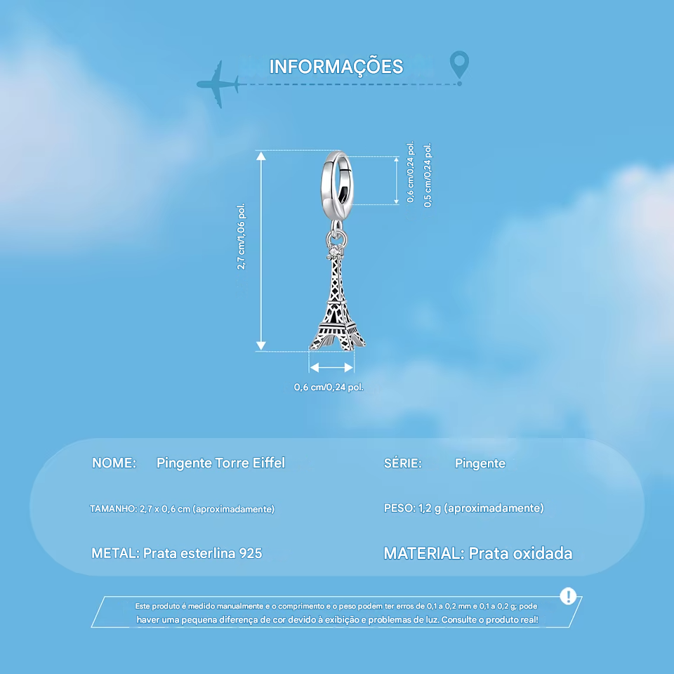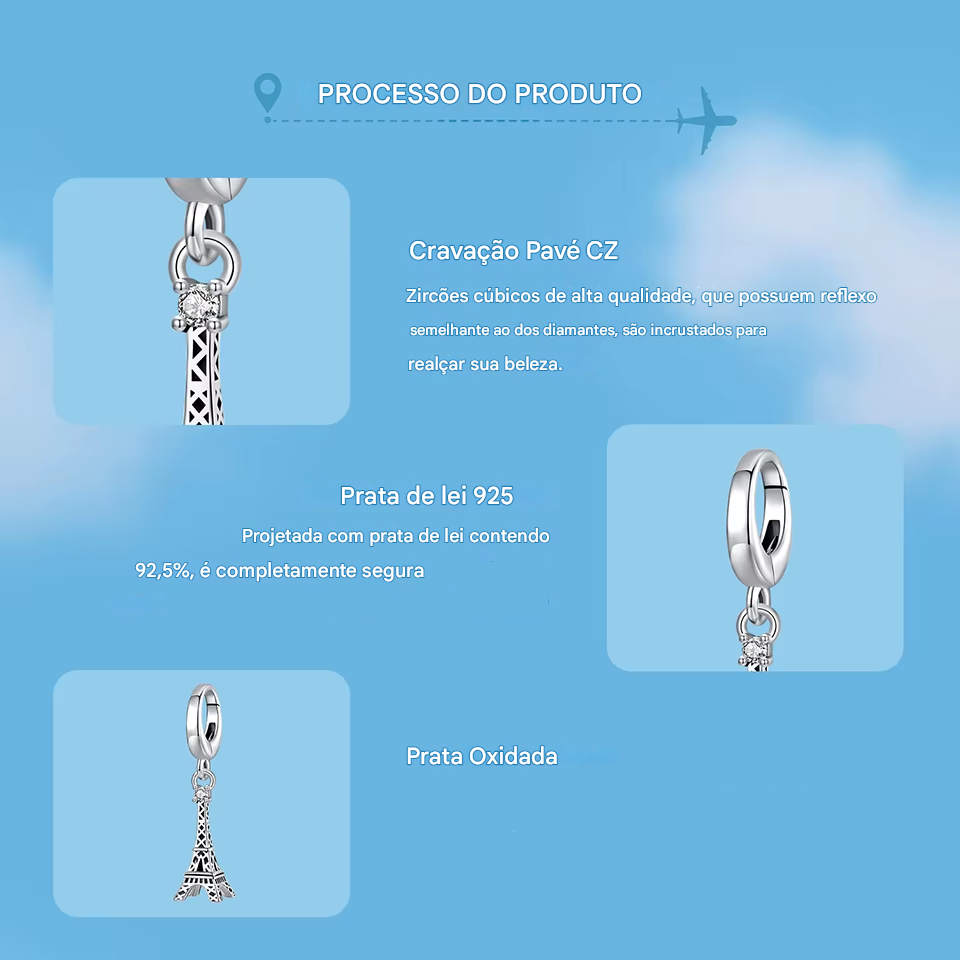 Pingente Eiffel coleção viajar em prata 925 e Zircônia de alta qualidade, porque esse sonho merece ir para sua pulseira ou colar!